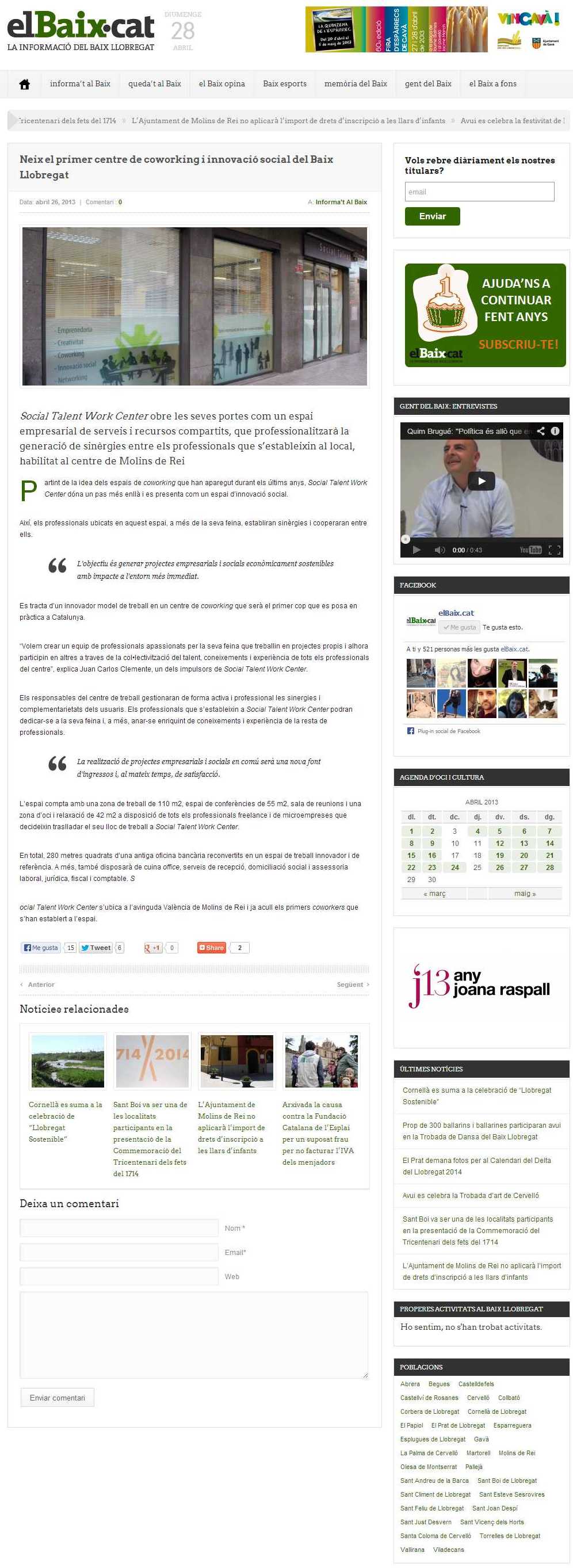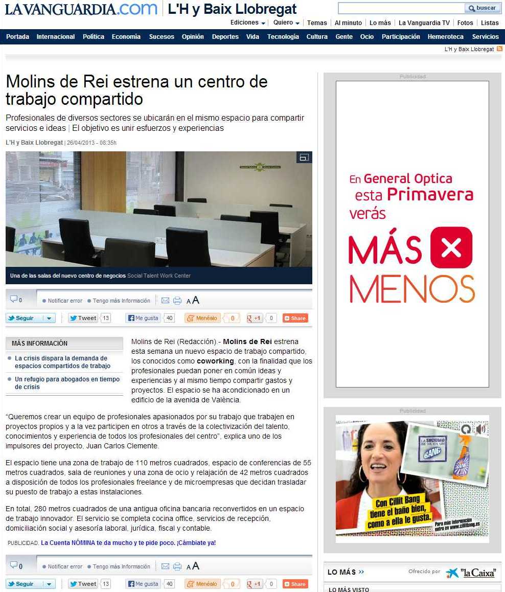 Viu Comunicació va gestionar la companya comunicacional del llançament del primer centre de coworking de Molins de Rei, Social Talent Work Center. En constant coordinació amb els impulsors d’aquesta iniciativa, vam organitzar la inauguració del recinte i la redacció de les notes de premsa d’aquest servei, aconseguint l¡èxit de sortir en els diferents mitjans de comunicació del Baix Llobregat així com a mitjans d’un àmbit més ampli com Televisió de Catalunya, La Vanguardia o El Mundo. També vam ajudar a definir els conceptes en el moment de gestació de la idea, fent-los comprensibles per a un públic generalista i vam formar als impulsors de Social Talent Work Center per tal de fer efectius en les entrevistes davant dels mitjans de comunicació.